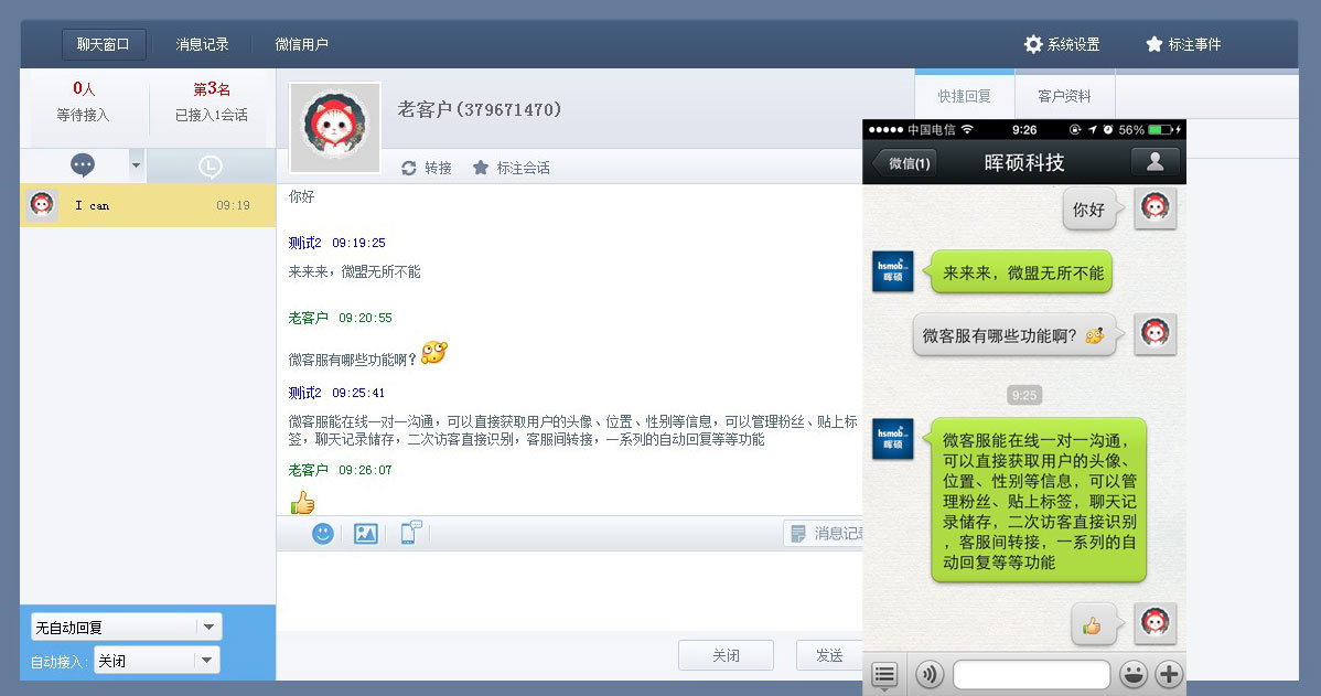 客户微信咨询啦!客户微信问价啦!客户微信买东西啦!咱们的客服在哪里?!在这里!已经认证的公众号可以通过微巨宝后台,进行客服工号添加,随后登录客服网页版,就可以实时跟您的用户聊天啦!